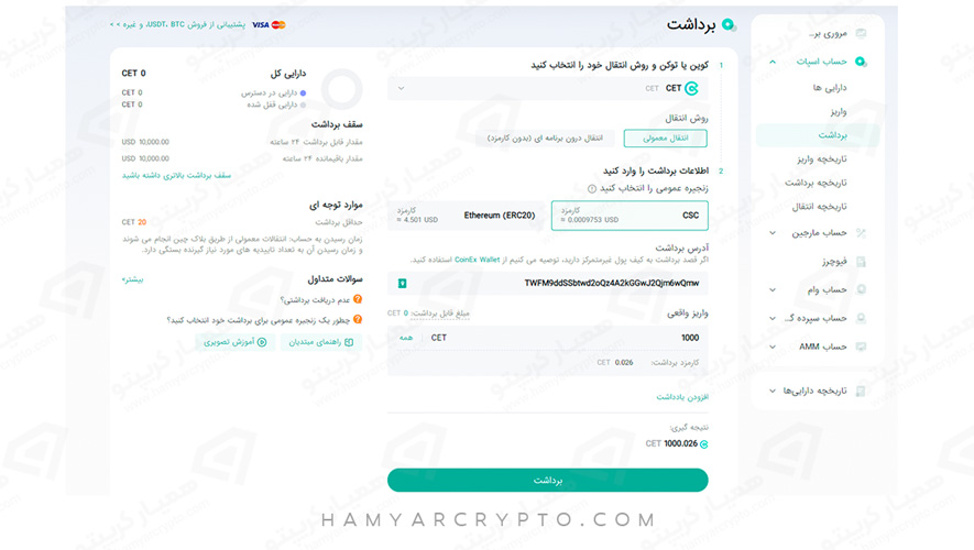 آموزش برداشت ارز دیجیتال از صرافی کوینکس
